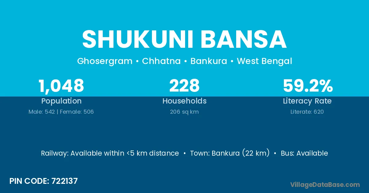 Bankura (22 km) is the nearest town to Shukuni Bansa village for major economic activities and is located approximately 22 km away.