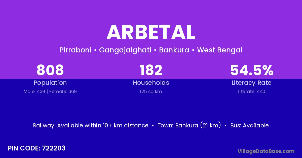 Bankura (21 km) is the nearest town to Arbetal village for major economic activities and is located approximately 21 km away.