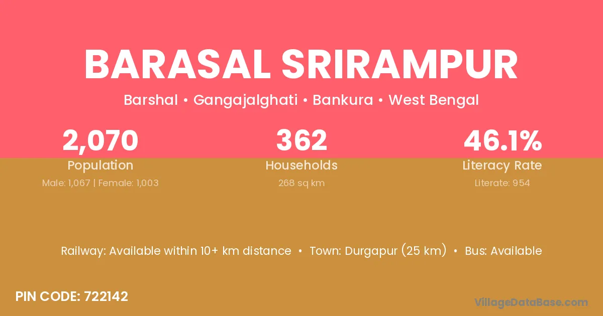 Durgapur (25 km) is the nearest town to Barasal Srirampur village for major economic activities and is located approximately 25 km away.