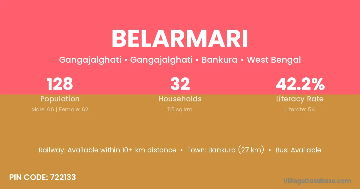 Bankura (27 km) is the nearest town to Belarmari village for major economic activities and is located approximately 27 km away.