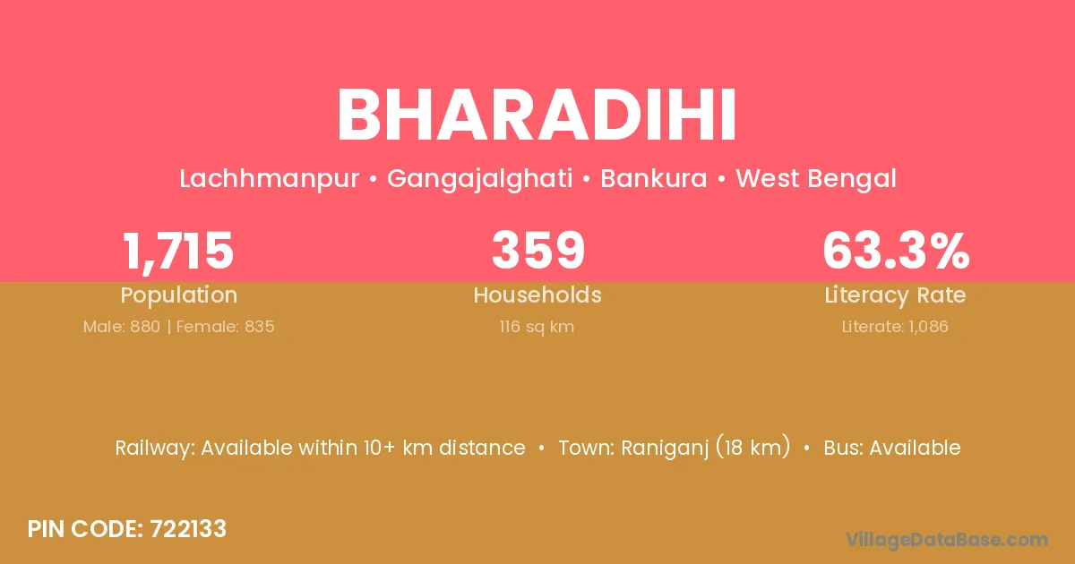 Raniganj (18 km) is the nearest town to Bharadihi village for major economic activities and is located approximately 18 km away.