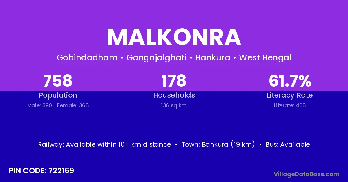 Bankura (19 km) is the nearest town to Malkonra village for major economic activities and is located approximately 19 km away.