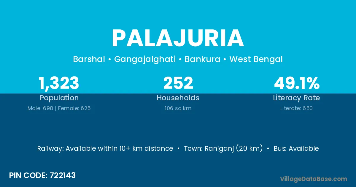 Raniganj (20 km) is the nearest town to Palajuria village for major economic activities and is located approximately 20 km away.