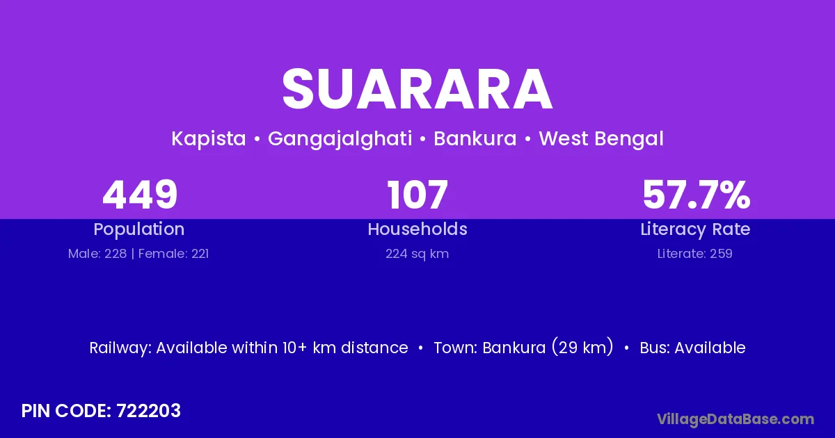 Bankura (29 km) is the nearest town to Suarara village for major economic activities and is located approximately 29 km away.
