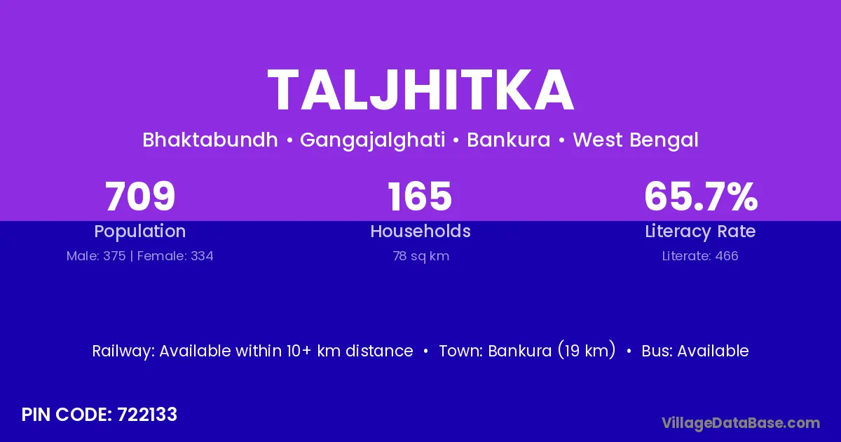 Bankura (19 km) is the nearest town to Taljhitka village for major economic activities and is located approximately 19 km away.