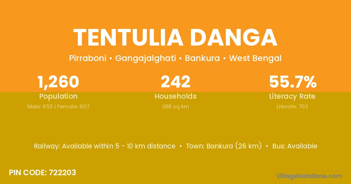 Bankura (26 km) is the nearest town to Tentulia Danga village for major economic activities and is located approximately 26 km away.