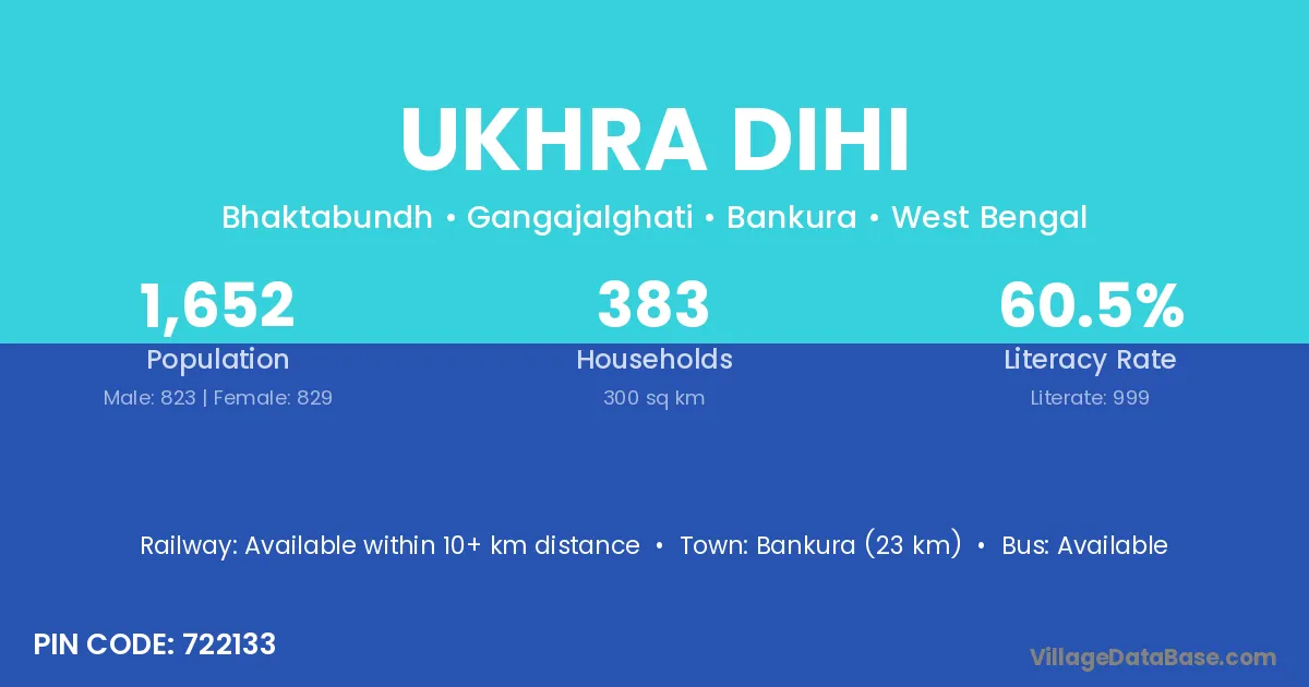 Bankura (23 km) is the nearest town to Ukhra Dihi village for major economic activities and is located approximately 23 km away.