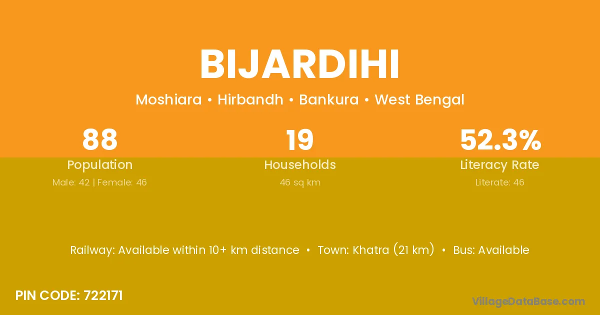 Khatra (21 km) is the nearest town to Bijardihi village for major economic activities and is located approximately 21 km away.