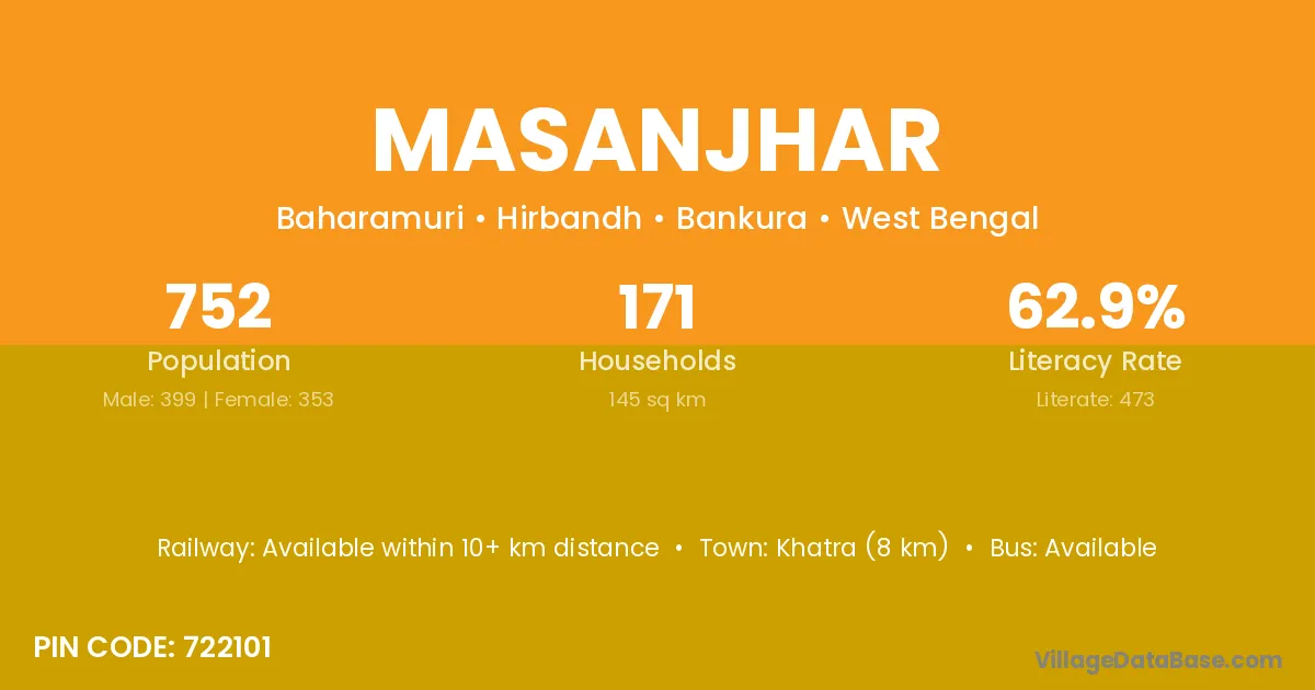 Khatra (8 km) is the nearest town to Masanjhar village for major economic activities and is located approximately 8 km away.