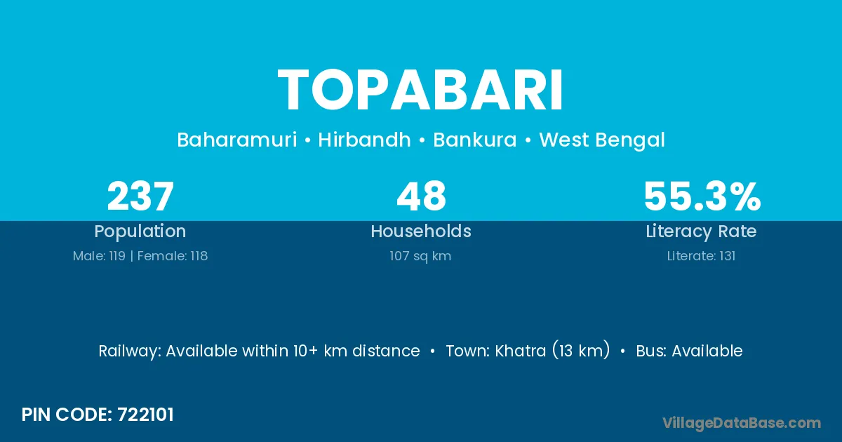 Khatra (13 km) is the nearest town to Topabari village for major economic activities and is located approximately 13 km away.