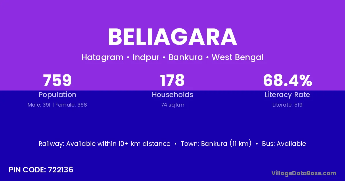 Bankura (11 km) is the nearest town to Beliagara village for major economic activities and is located approximately 11 km away.