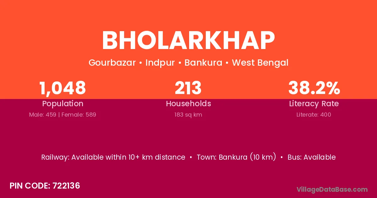 Bankura (10 km) is the nearest town to Bholarkhap village for major economic activities and is located approximately 10 km away.