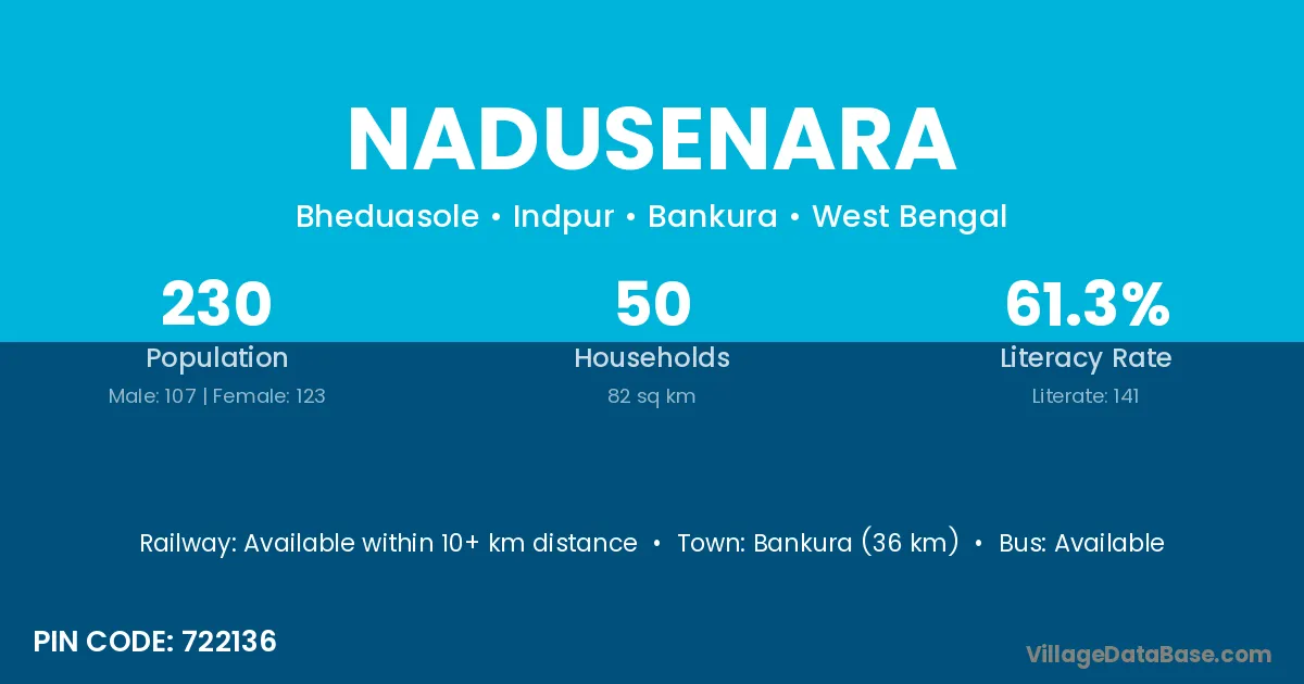 Bankura (36 km) is the nearest town to Nadusenara village for major economic activities and is located approximately 36 km away.