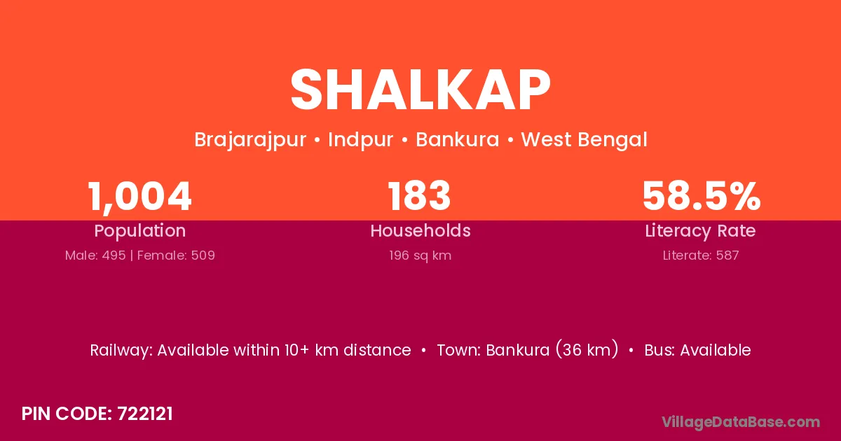 Bankura (36 km) is the nearest town to Shalkap village for major economic activities and is located approximately 36 km away.