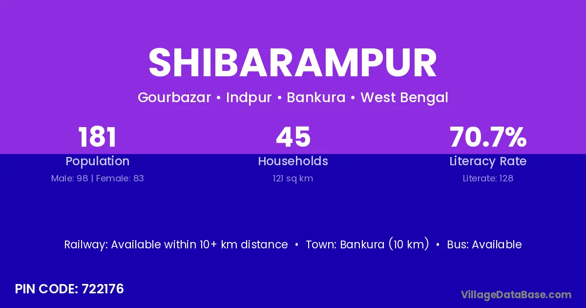 Bankura (10 km) is the nearest town to Shibarampur village for major economic activities and is located approximately 10 km away.