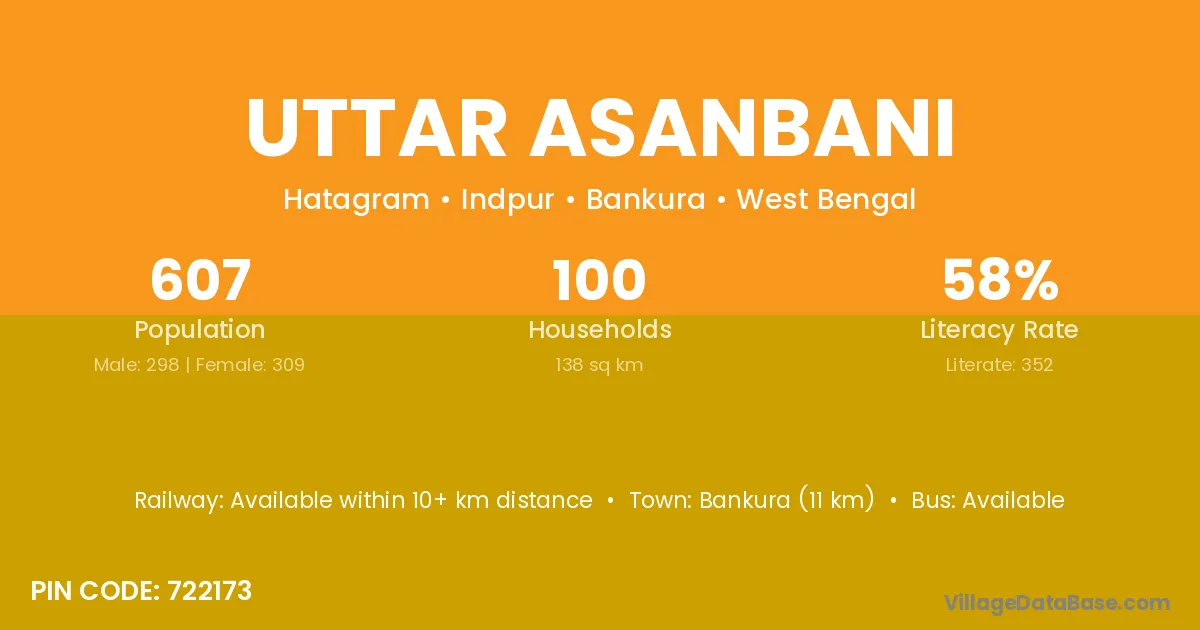 Bankura (11 km) is the nearest town to Uttar Asanbani village for major economic activities and is located approximately 11 km away.