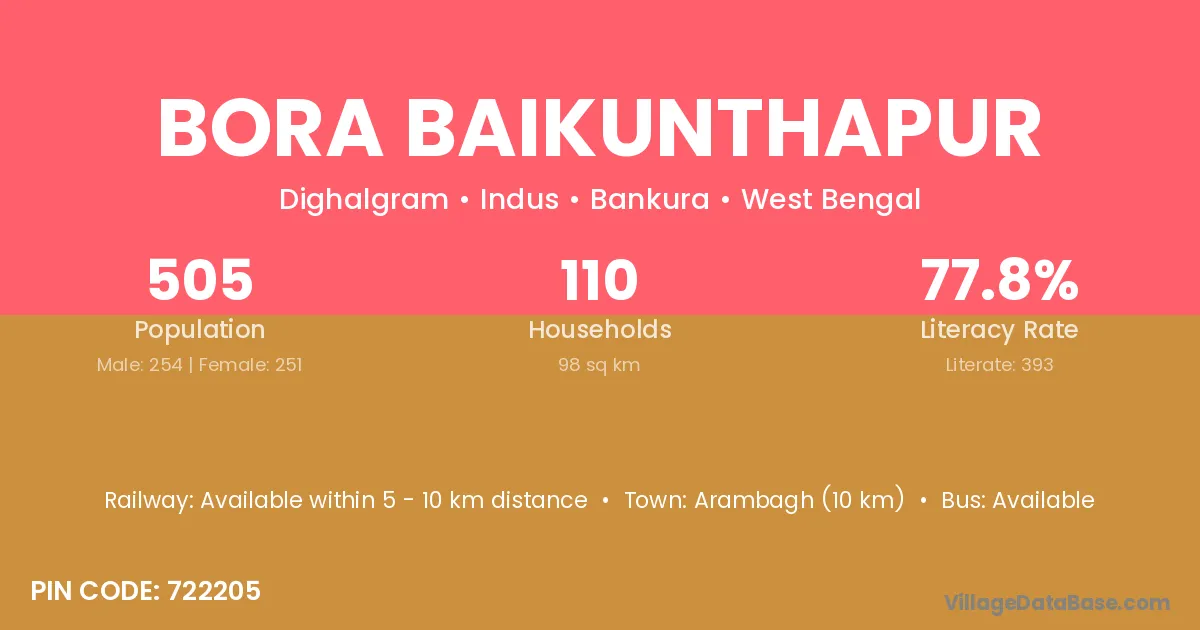 Bora Baikunthapur village has a total population of 505 people, of which 254 are males and 251 are females.