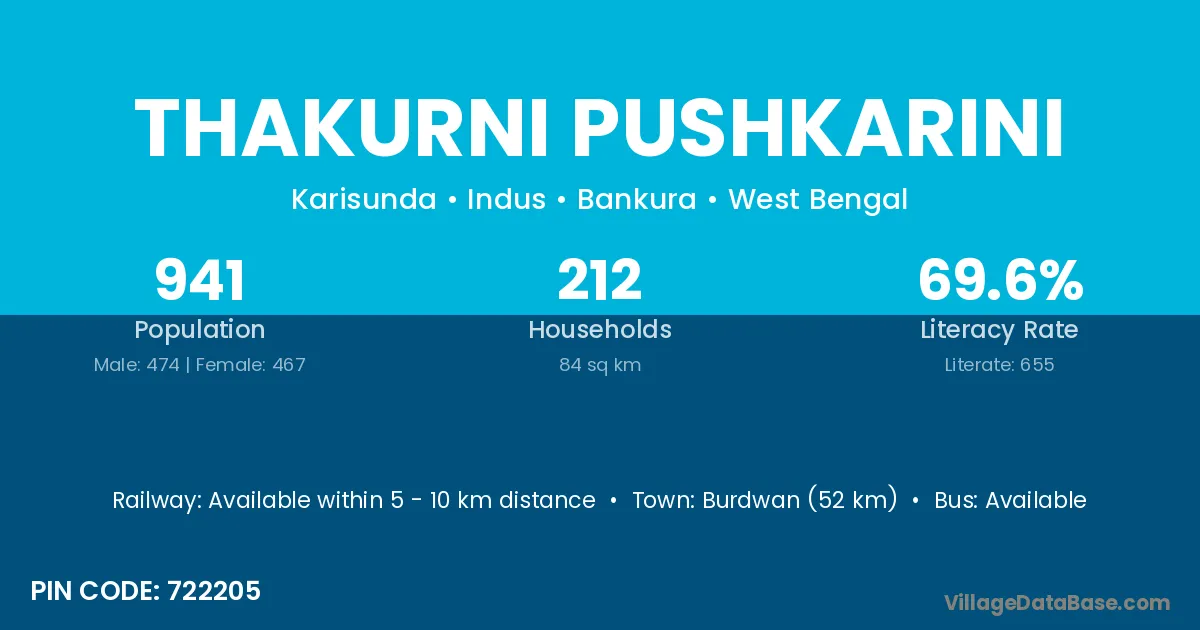 Thakurni Pushkarini village has a total population of 941 people, of which 474 are males and 467 are females.