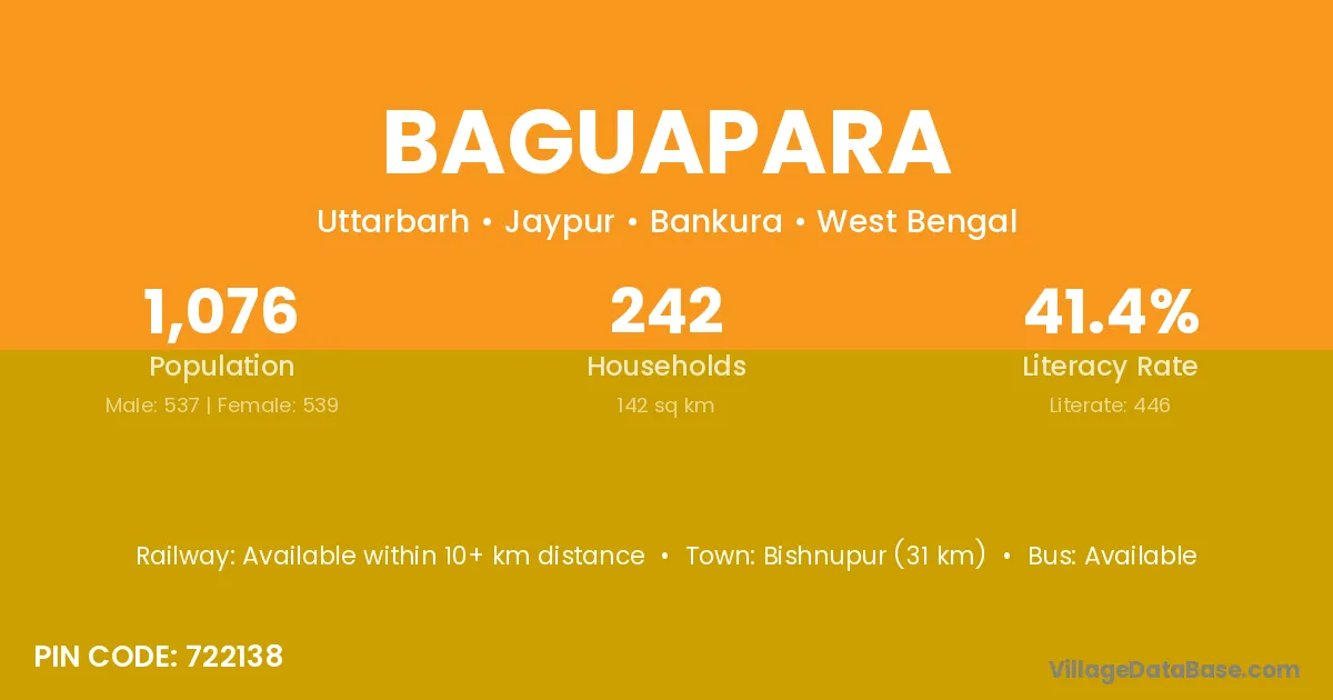 Bishnupur (31 km) is the nearest town to Baguapara village for major economic activities and is located approximately 31 km away.