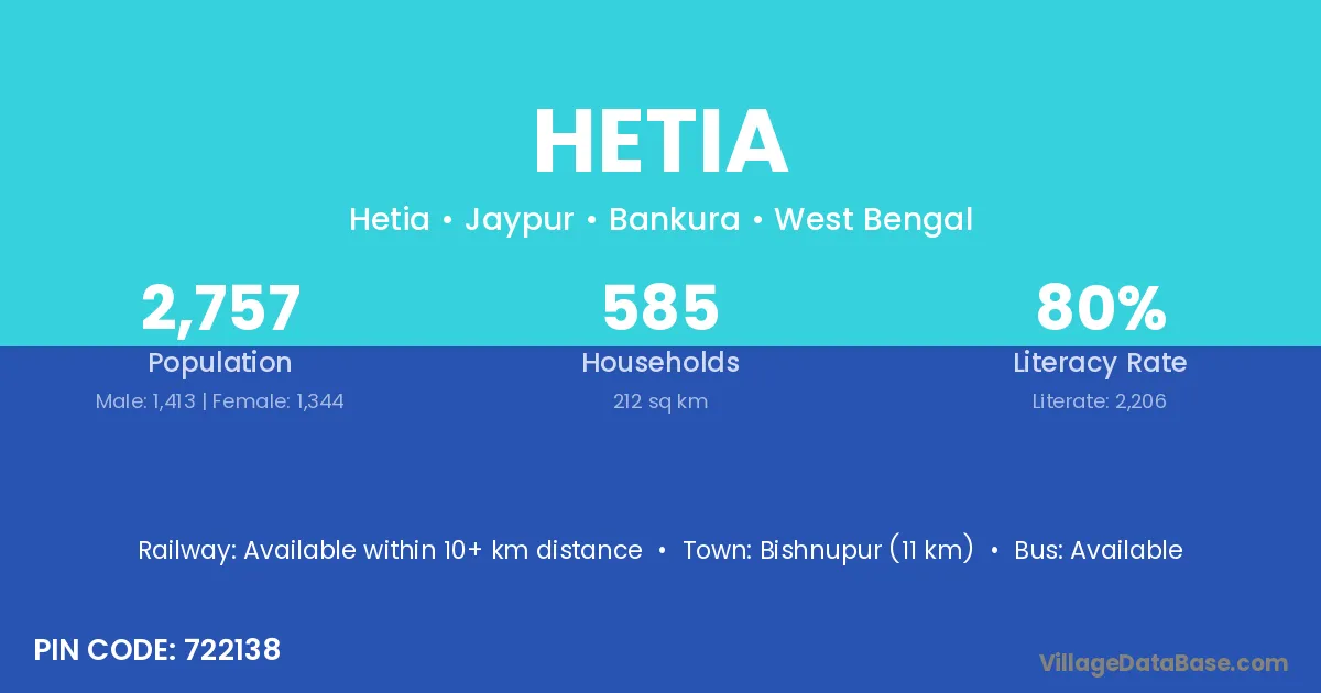 Bishnupur (11 km) is the nearest town to Hetia village for major economic activities and is located approximately 11 km away.