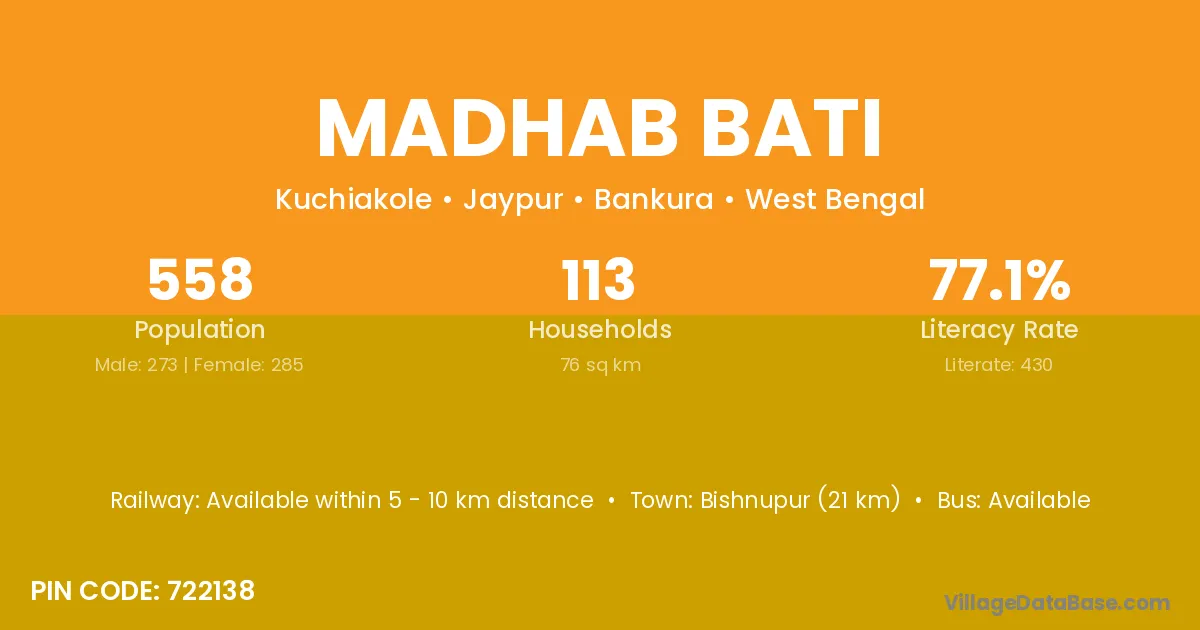 Bishnupur (21 km) is the nearest town to Madhab Bati village for major economic activities and is located approximately 21 km away.