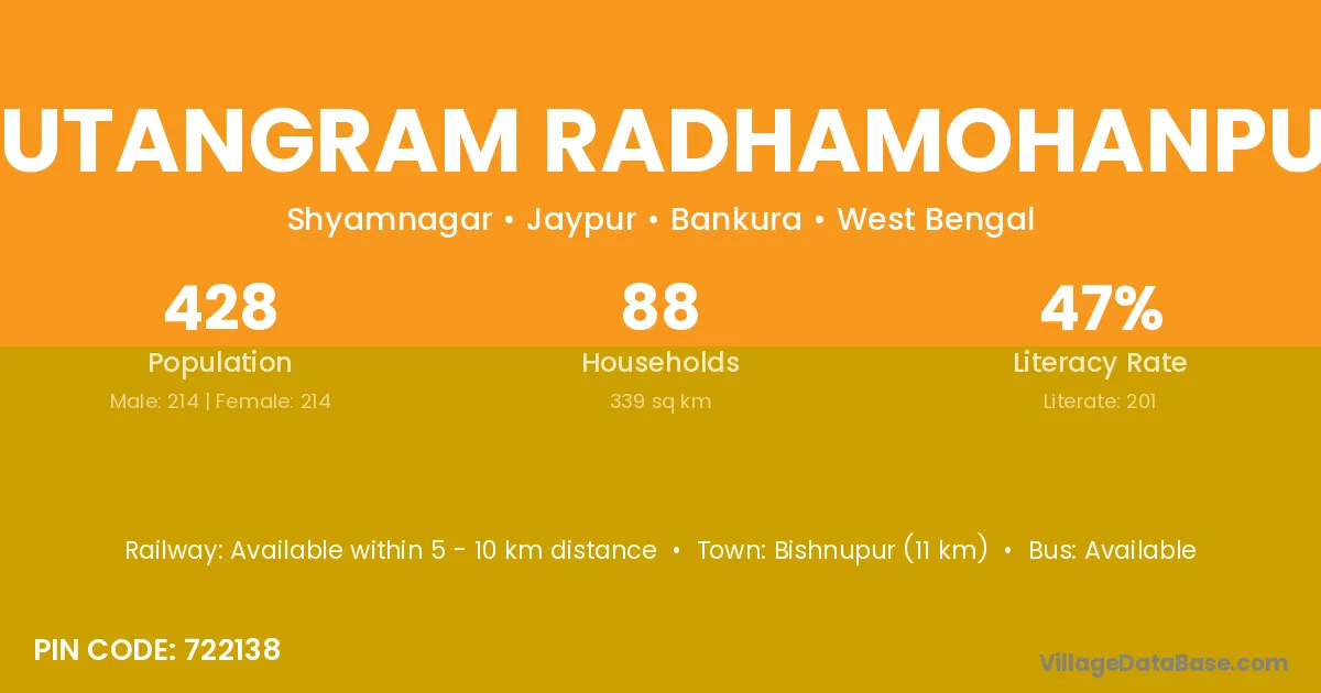 Nutangram Radhamohanpur village has a total population of 428 people, of which 214 are males and 214 are females.