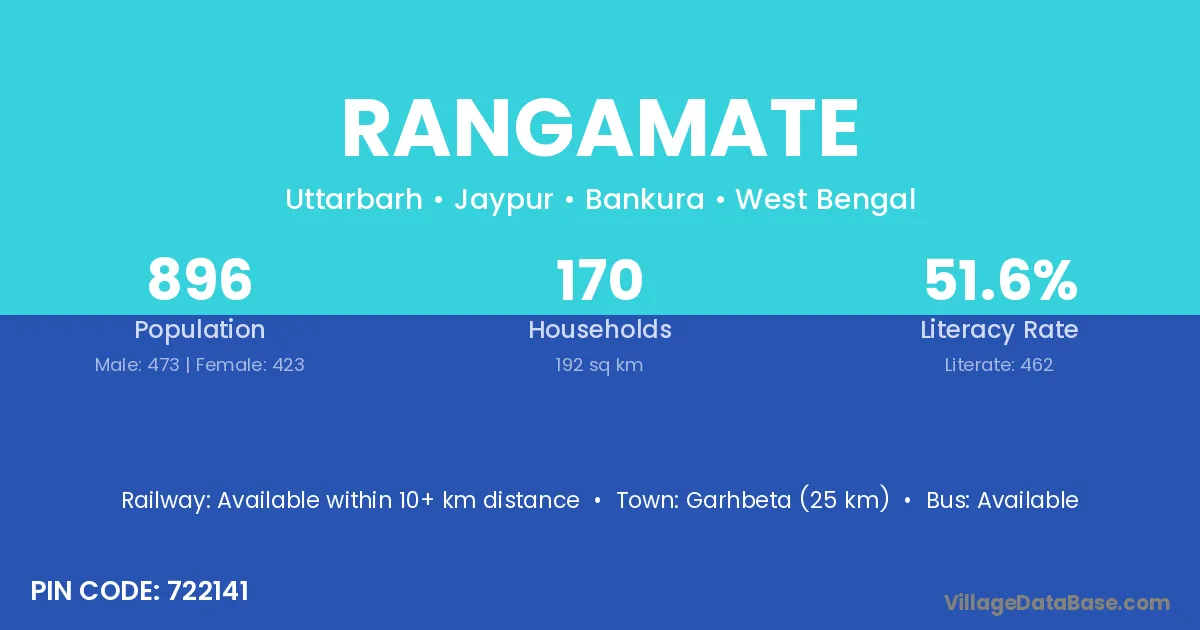 Garhbeta (25 km) is the nearest town to Rangamate village for major economic activities and is located approximately 25 km away.