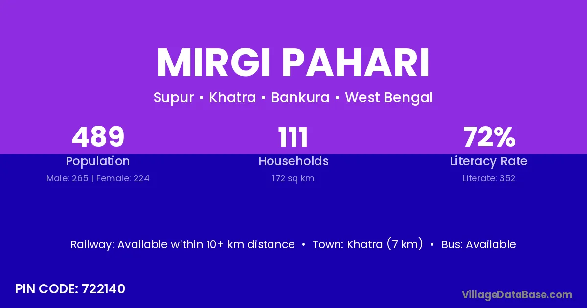 Khatra (7 km) is the nearest town to Mirgi Pahari village for major economic activities and is located approximately 7 km away.
