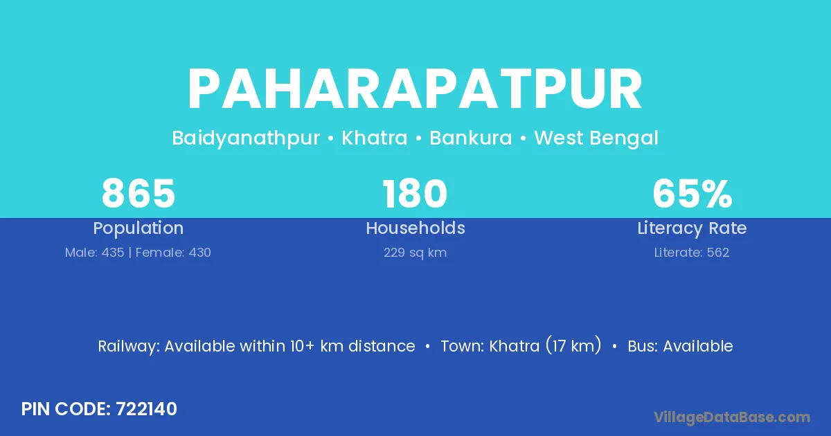Khatra (17 km) is the nearest town to Paharapatpur village for major economic activities and is located approximately 17 km away.