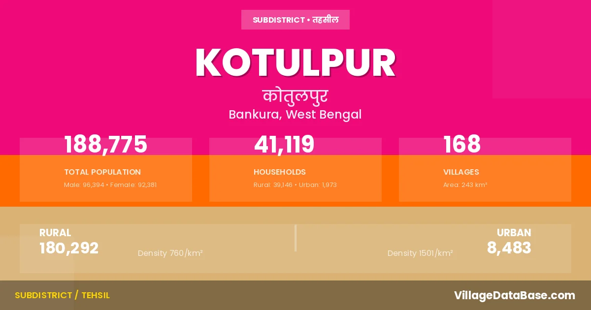 According to the 2011 census The total area of Kotulpur Subdivision is 243 km², with a population of 188775 people. The population density is 777 inhabitants per square kilometre, and there are approximately 41119 houses in the sub district.