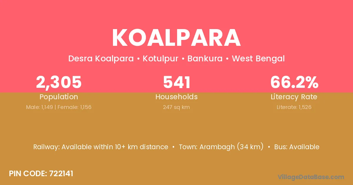 Arambagh (34 km) is the nearest town to Koalpara village for major economic activities and is located approximately 34 km away.