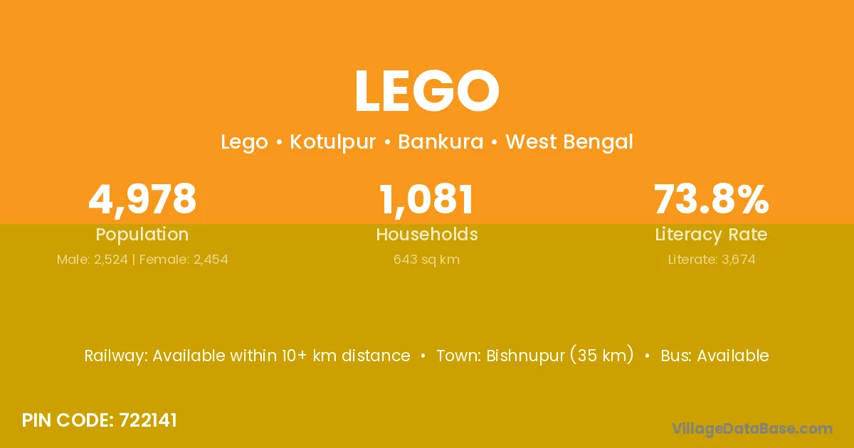 Lego village has a total population of 4,978 people, of which 2,524 are males and 2,454 are females.