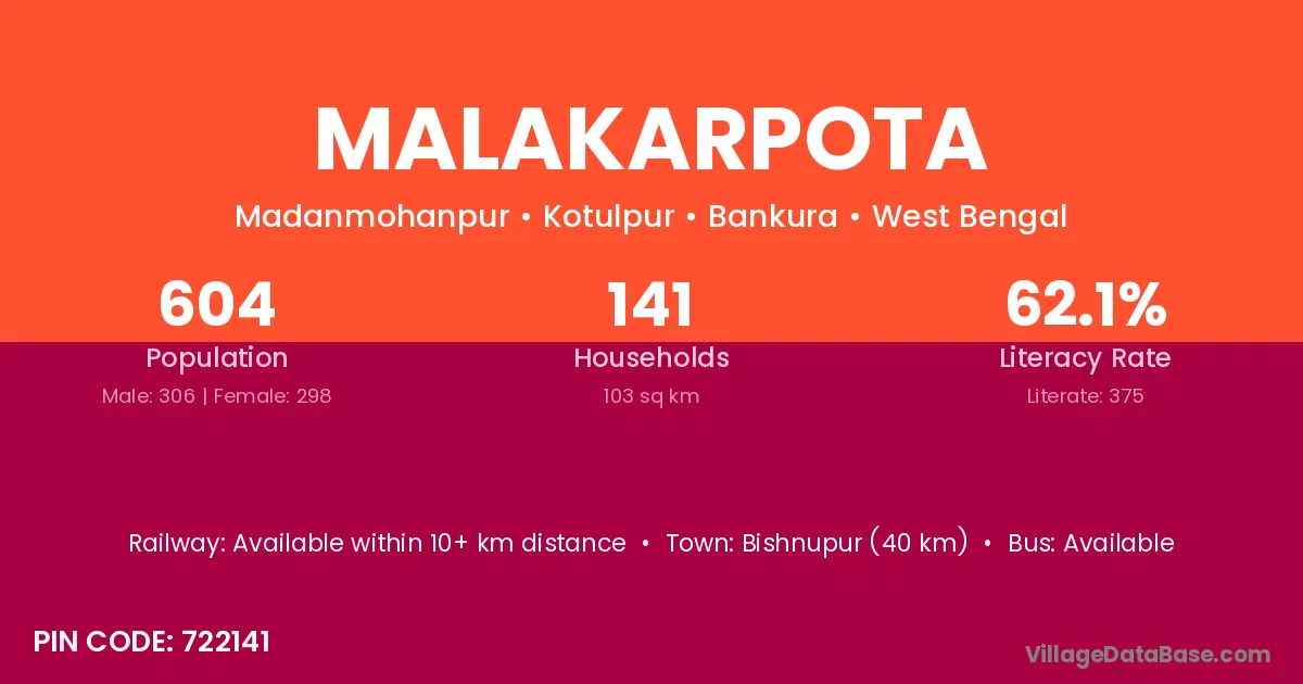Bishnupur (40 km) is the nearest town to Malakarpota village for major economic activities and is located approximately 40 km away.