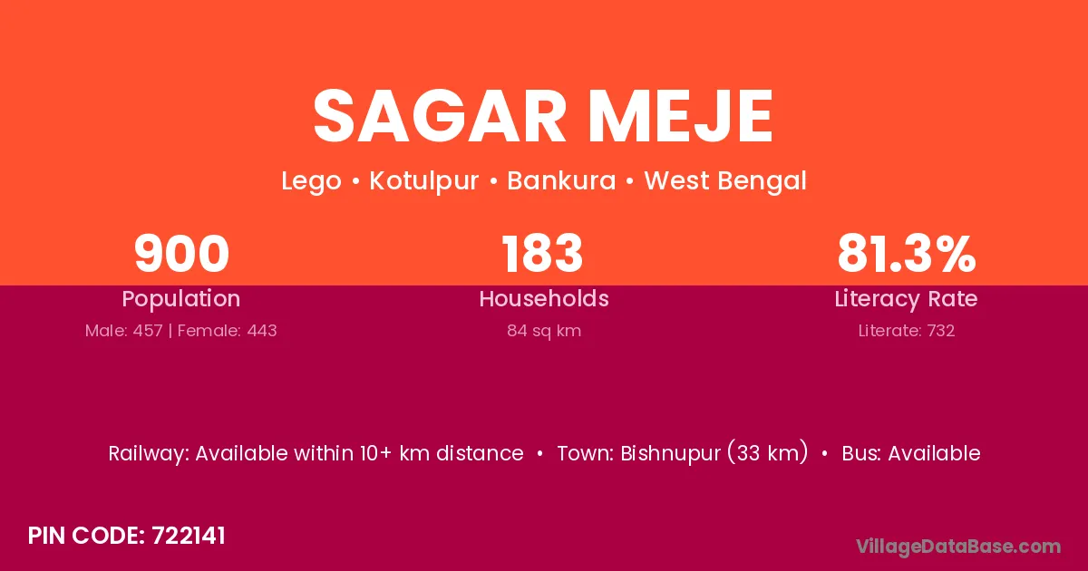 Bishnupur (33 km) is the nearest town to Sagar Meje village for major economic activities and is located approximately 33 km away.