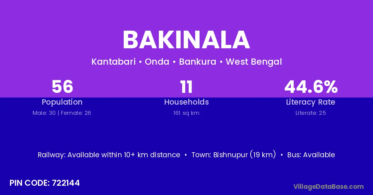 Bishnupur (19 km) is the nearest town to Bakinala village for major economic activities and is located approximately 19 km away.