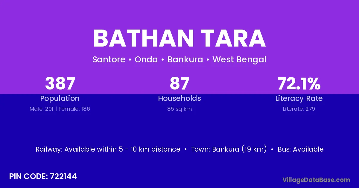Bankura (19 km) is the nearest town to Bathan Tara village for major economic activities and is located approximately 19 km away.