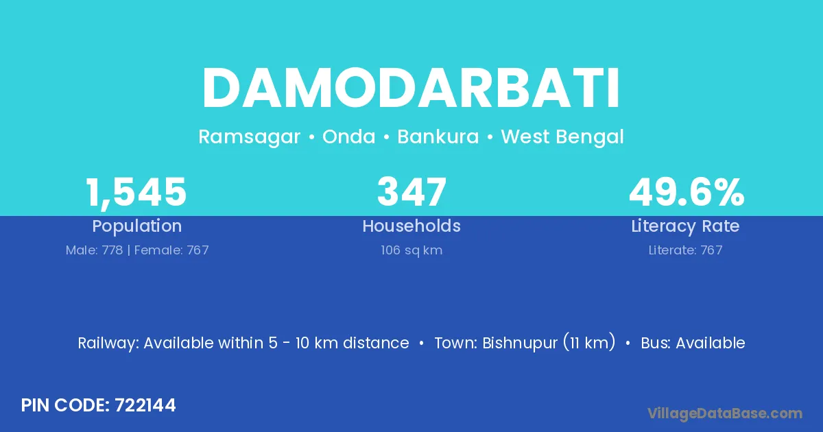 Bishnupur (11 km) is the nearest town to Damodarbati village for major economic activities and is located approximately 11 km away.