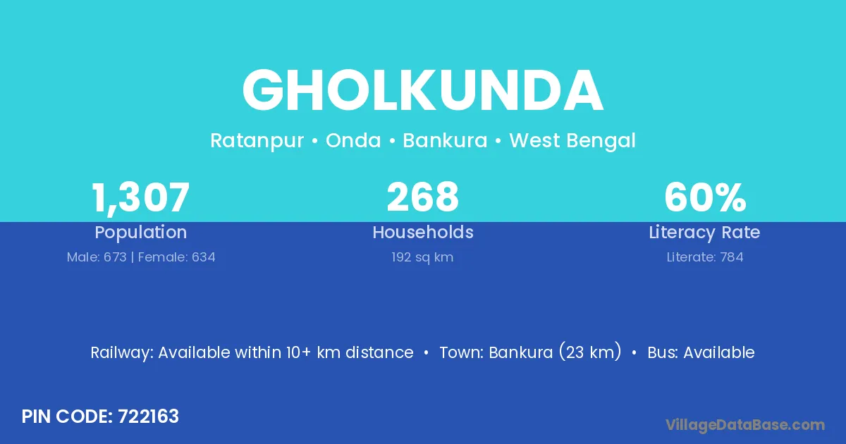 Bankura (23 km) is the nearest town to Gholkunda village for major economic activities and is located approximately 23 km away.