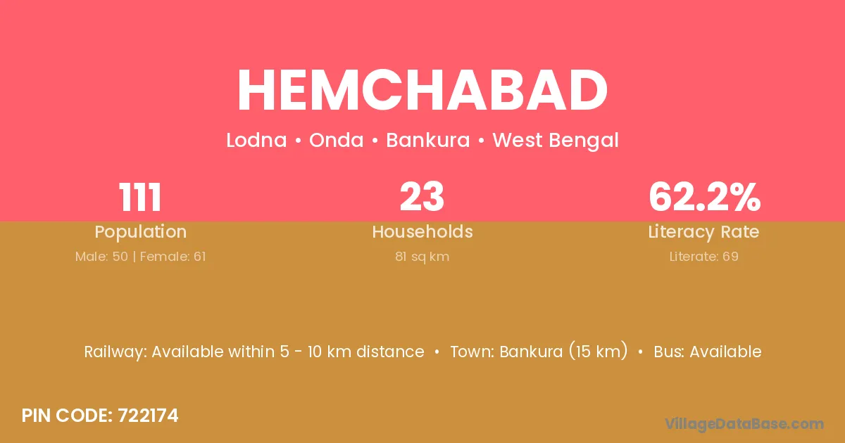 Bankura (15 km) is the nearest town to Hemchabad village for major economic activities and is located approximately 15 km away.