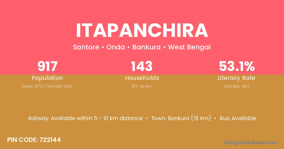 Bankura (15 km) is the nearest town to Itapanchira village for major economic activities and is located approximately 15 km away.