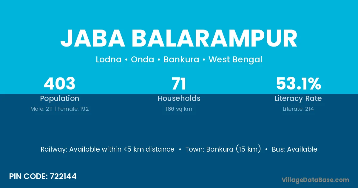 Bankura (15 km) is the nearest town to Jaba Balarampur village for major economic activities and is located approximately 15 km away.