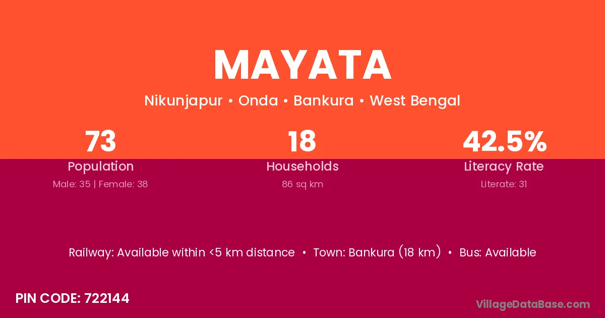 Bankura (18 km) is the nearest town to Mayata village for major economic activities and is located approximately 18 km away.