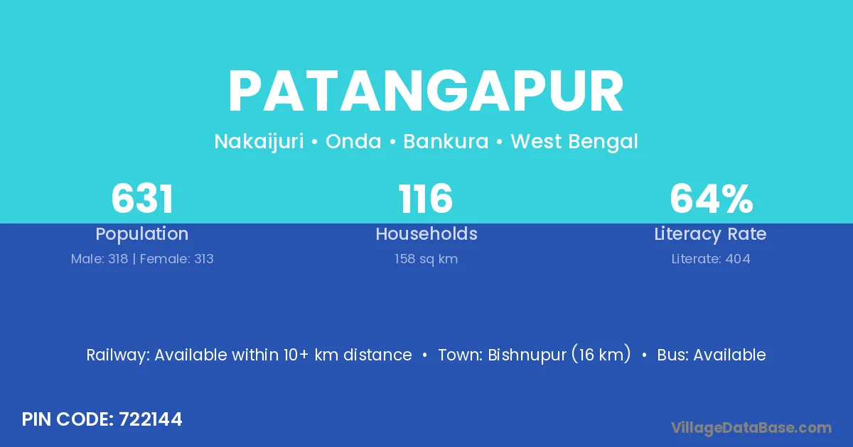 Bishnupur (16 km) is the nearest town to Patangapur village for major economic activities and is located approximately 16 km away.