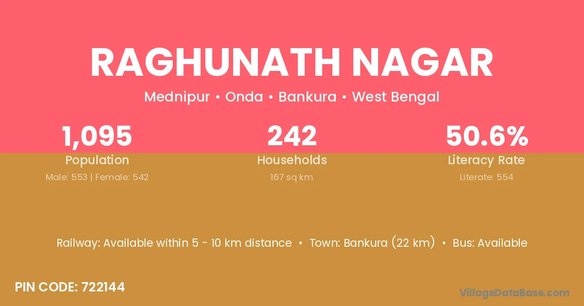 Bankura (22 km) is the nearest town to Raghunath Nagar village for major economic activities and is located approximately 22 km away.