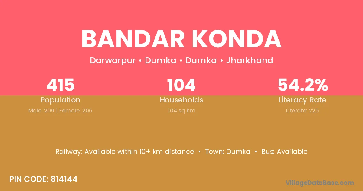 The literacy rate of Bandar Konda village is 63.21%. Male literacy stands at 69.23% and female literacy at 57.41%.