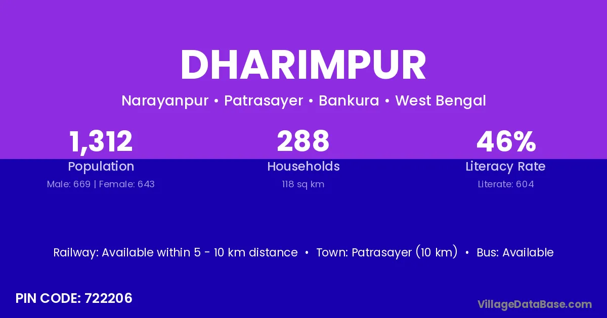 Patrasayer (10 km) is the nearest town to Dharimpur village for major economic activities and is located approximately 10 km away.