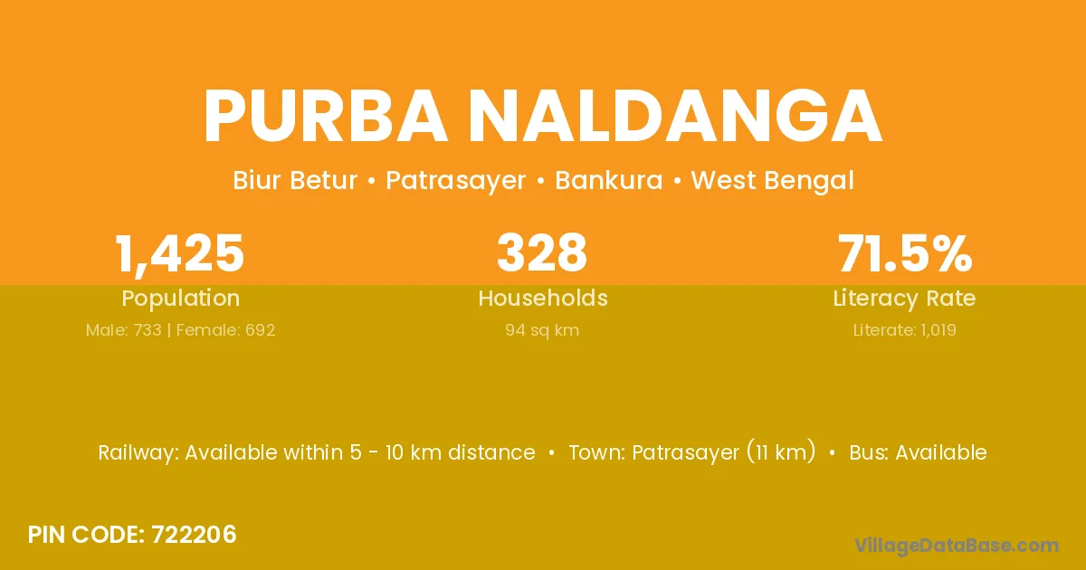Patrasayer (11 km) is the nearest town to Purba Naldanga village for major economic activities and is located approximately 11 km away.