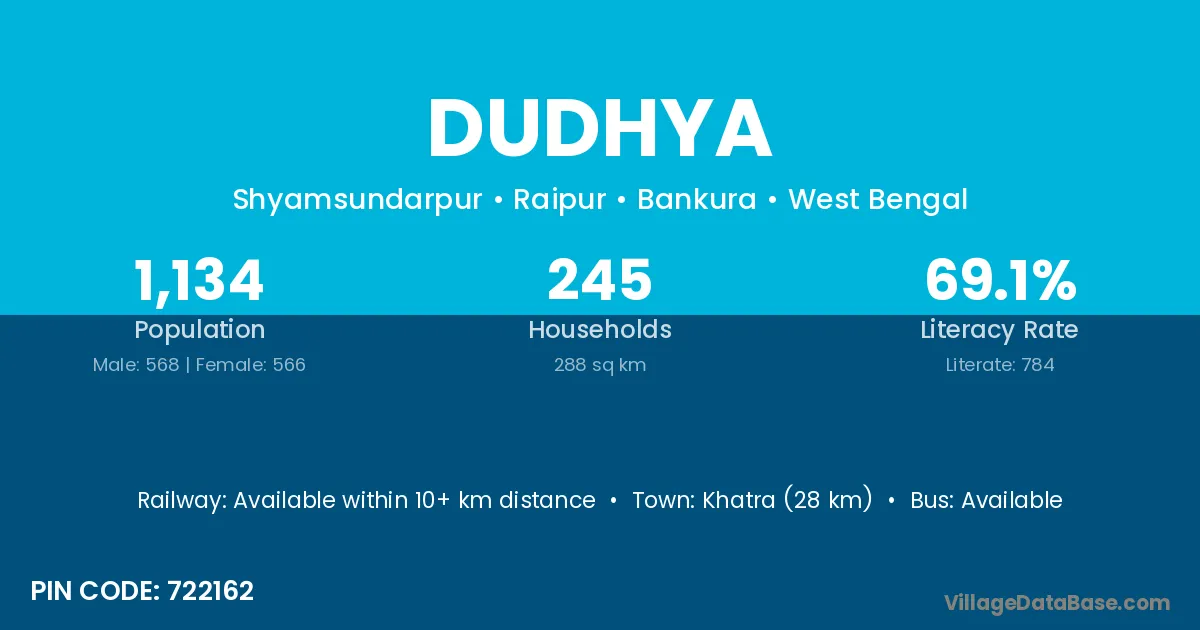 Khatra (28 km) is the nearest town to Dudhya village for major economic activities and is located approximately 28 km away.