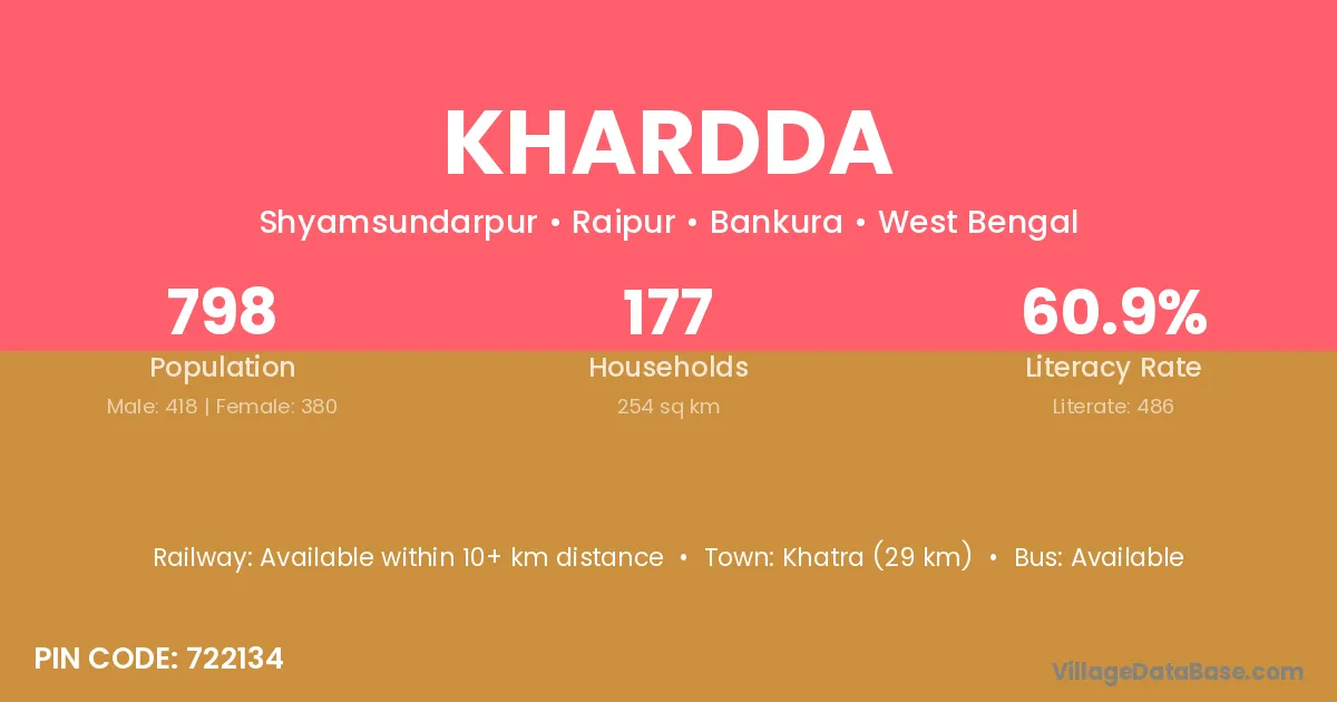 Khatra (29 km) is the nearest town to Khardda village for major economic activities and is located approximately 29 km away.