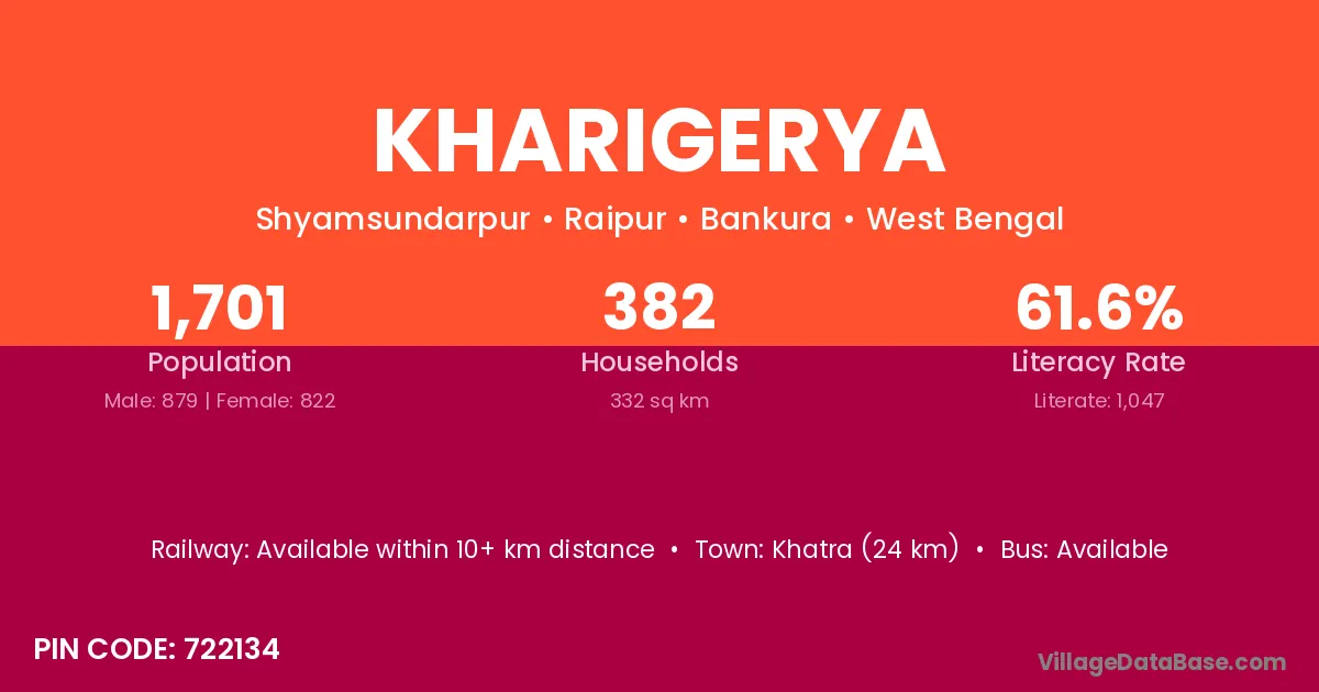 According to Census 2011 information, the village code of Kharigerya village is 722134.